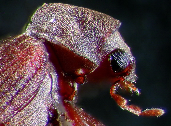 | Die Vollinsekten der Rüsselkäfer (Familie: Curculionidae) sind braun, dunkelbraun bis schwarz und artspezifisch unterschiedlich lang. Ein kennzeichnendes Merkmal ist der Kopf, der mehr oder minder stark zum Rüssel ausgezogen ist (Bild). Typische Rüsselkäfer-Arten für Gebäude sind der Grubenholzkäfer (Hexarthrum exiguum = Rhyncolus culinris) - er ist 2,5-4 mm lang - und der Nadelholz-Rindenrüssler (Brachytemnus porcatus) - er ist 3-3,8 mm lang. Hinweis: Die Rüsselkäfer werden von uns nur bis zur Gruppe hin bestimmt. |